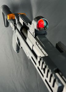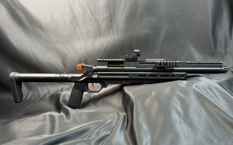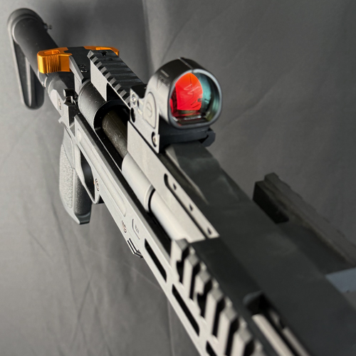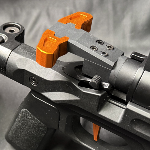 右でも左でも利き手や環境に気を遣わず、射撃体勢に入ることができるカスタムパーツです。